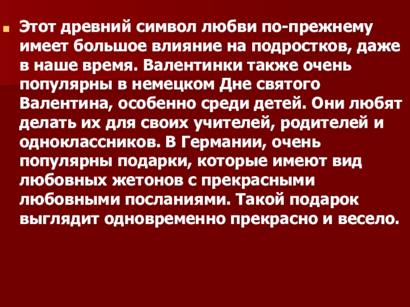 в наше время. Валентинки также очень популярны в немецком Дне святого Валентина, особенно среди детей. Они любят делать их для своих учителей, родителей и одноклассников. В Германии, очень популярны подарки, которые имеют вид любовных жетонов с прекрасными любовными посланиями. Такой подарок выглядит одновременно прекрасно и весело.