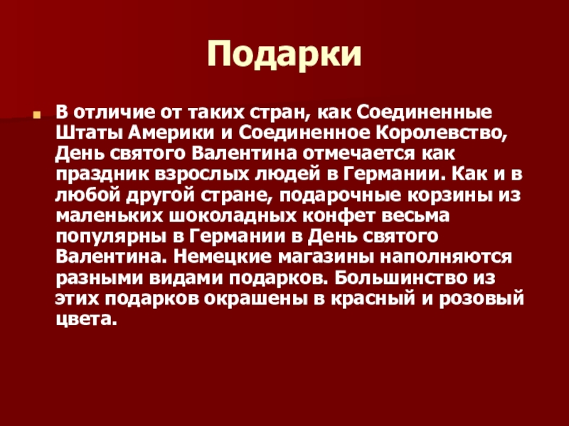 Соединенное Королевство, День святого Валентина отмечается как праздник взрослых людей в Германии. Как и в любой другой стране, подарочные корзины из маленьких шоколадных конфет весьма популярны в Германии в День святого Валентина. Немецкие магазины наполняются разными видами подарков. Большинство из этих подарков окрашены в красный и розовый цвета.