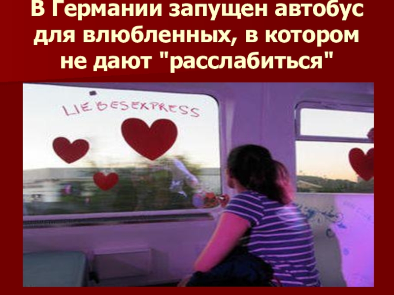 Слайд 25В Германии запущен автобус для влюбленных, в котором не дают "расслабиться"