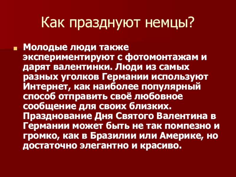 Люди из самых разных уголков Германии используют Интернет, как наиболее популярный способ отправить своё любовное сообщение для своих близких. Празднование Дня Святого Валентина в Германии может быть не так помпезно и громко, как в Бразилии или Америке, но достаточно элегантно и красиво.