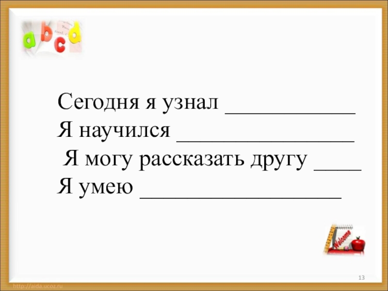 Сегодня я узнал ___________Я научился _______________ Я могу рассказать другу ____Я умею _________________