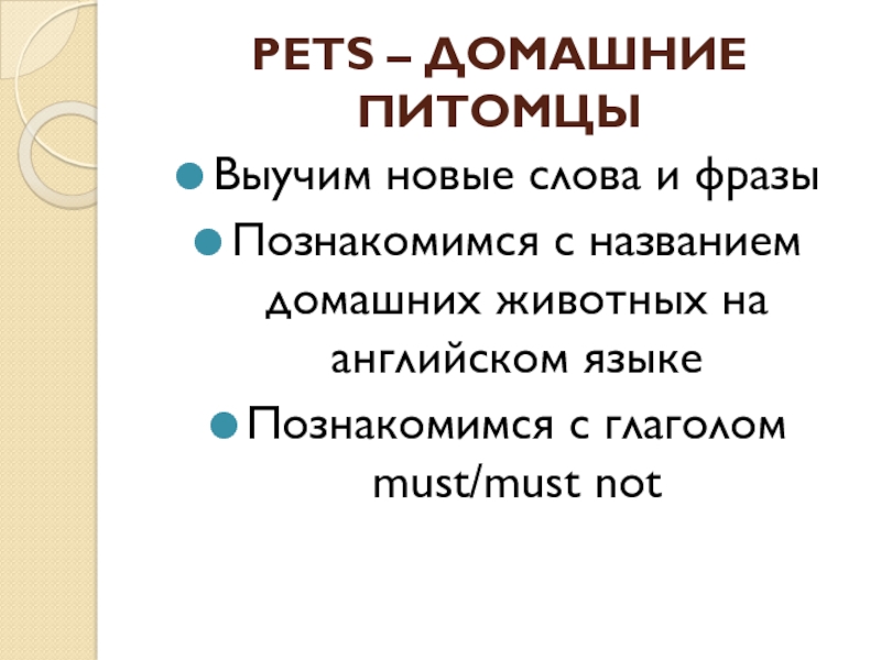 PETS – ДОМАШНИЕ ПИТОМЦЫВыучим новые слова и фразыПознакомимся с названием домашних животных на английском языкеПознакомимся с глаголом must/must not
