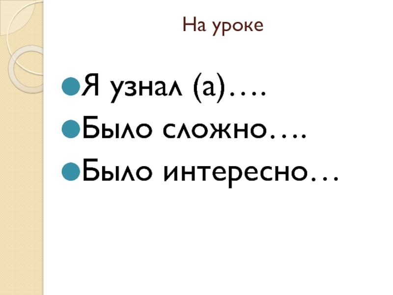 На уроке Я узнал (а)….Было сложно….Было интересно…