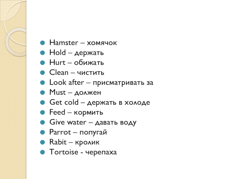 Hamster – хомячокHold – держатьHurt – обижатьClean – чиститьLook after – присматривать заMust – долженGet cold –