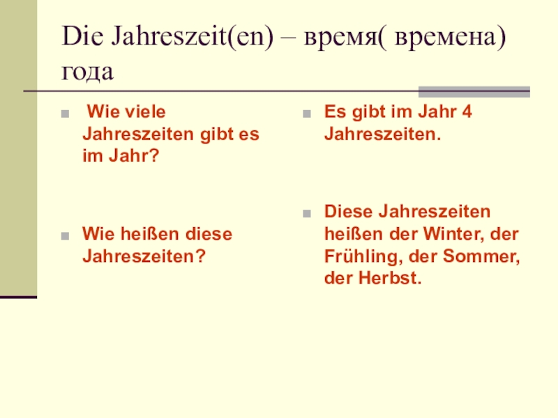 Diese Jahreszeiten heißen der Winter, der Frühling, der Sommer, der Herbst.