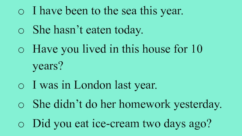 I have been to the sea this year.She hasn’t eaten today.Have you lived in this house for