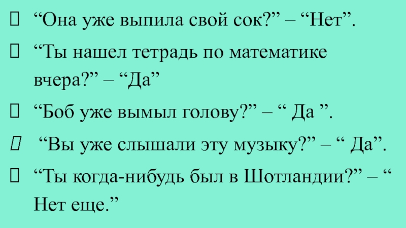 “Она уже выпила свой сок?” – “Нет”. “Ты нашел тетрадь по математике вчера?” – “Да” “Боб уже