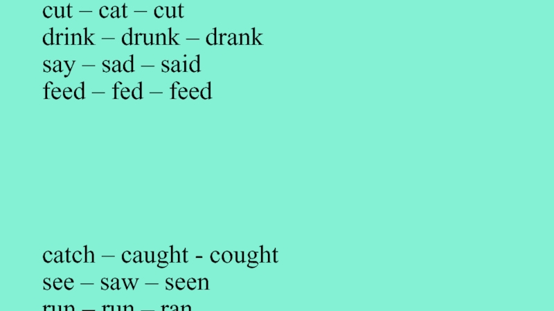 – drank say – sad – said feed – fed – feed catch – caught - cought see – saw – seеn run – run – ran go – went – gone have – hed – had