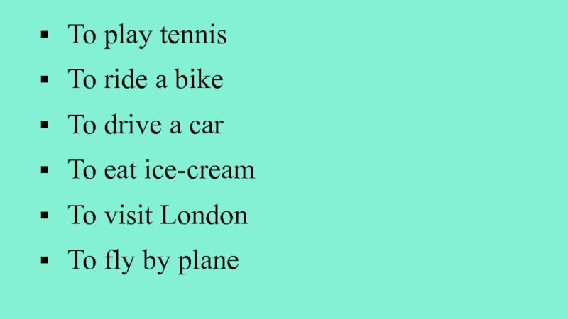 To play tennis To ride a bike To drive a car To eat ice-cream To visit London