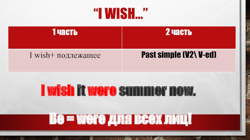 “I wish…”I wish it were summer now.Be = were для всех лиц!