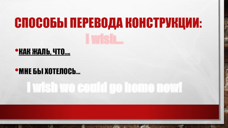 Способы перевода конструкции:Как жаль, что….Мне бы хотелось…I wish…I wish we could go home now!