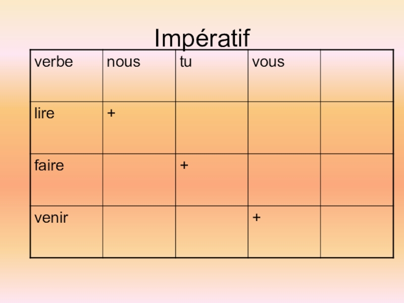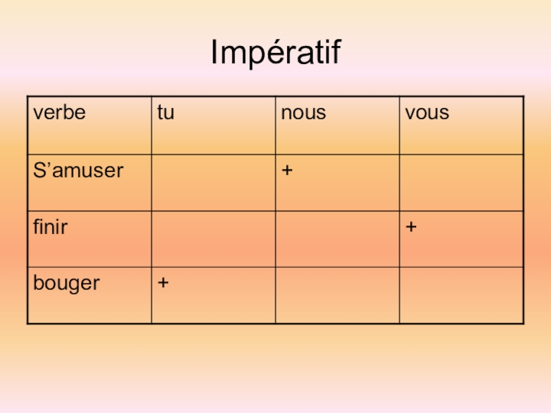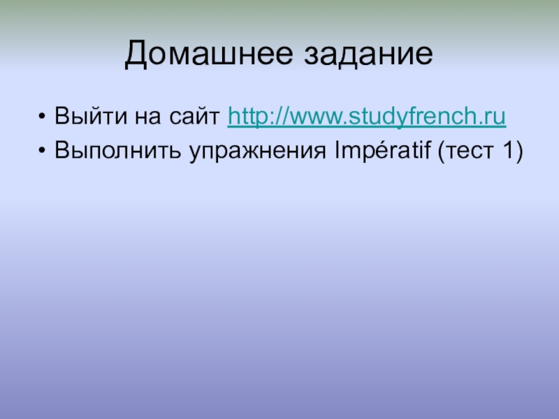 Домашнее заданиеВыйти на сайт http://www.studyfrench.ruВыполнить упражнения Impératif (тест 1)