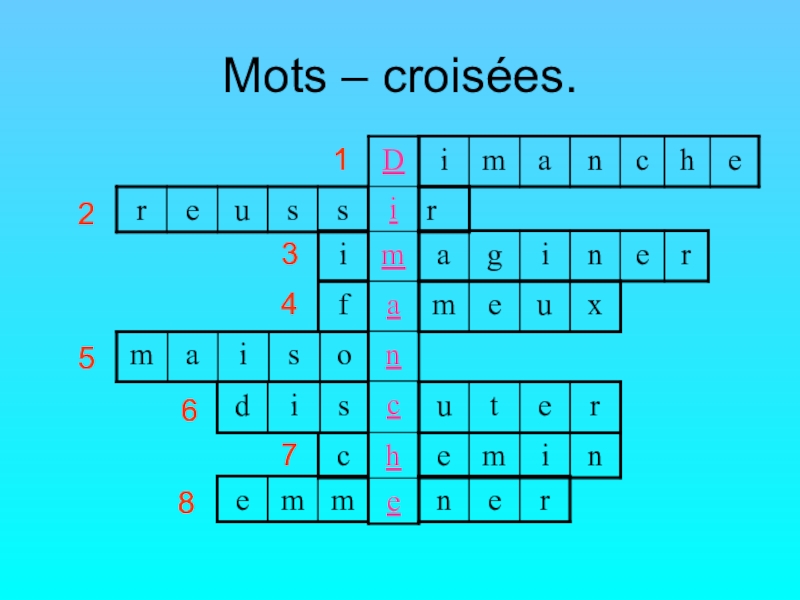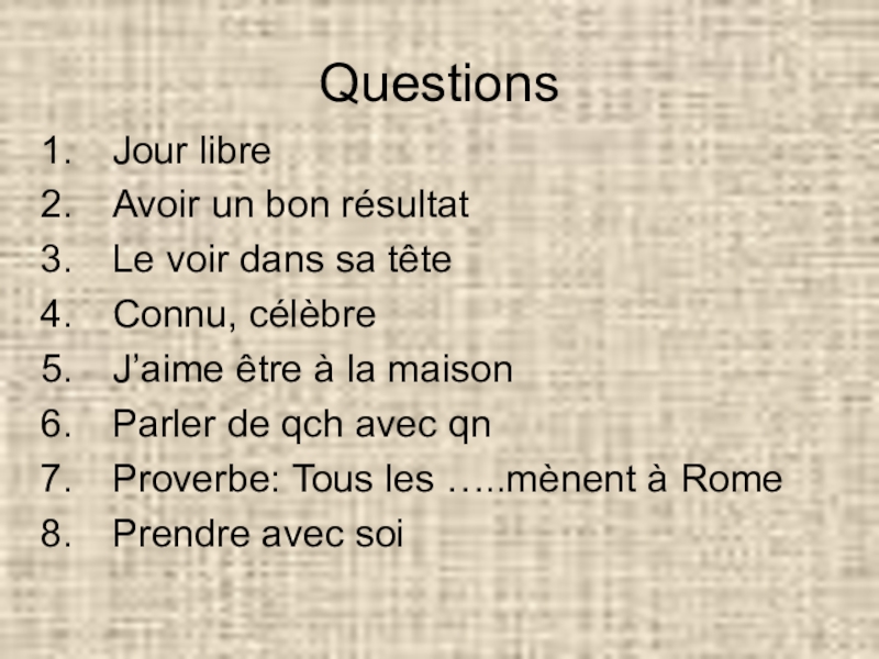 QuestionsJour libreAvoir un bon résultatLe voir dans sa tête  Connu, célèbreJ’aime être à la maison Parler
