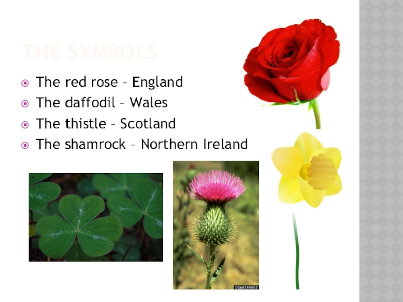 The symbolsThe red rose – EnglandThe daffodil – Wales The thistle – ScotlandThe shamrock – Northern Ireland