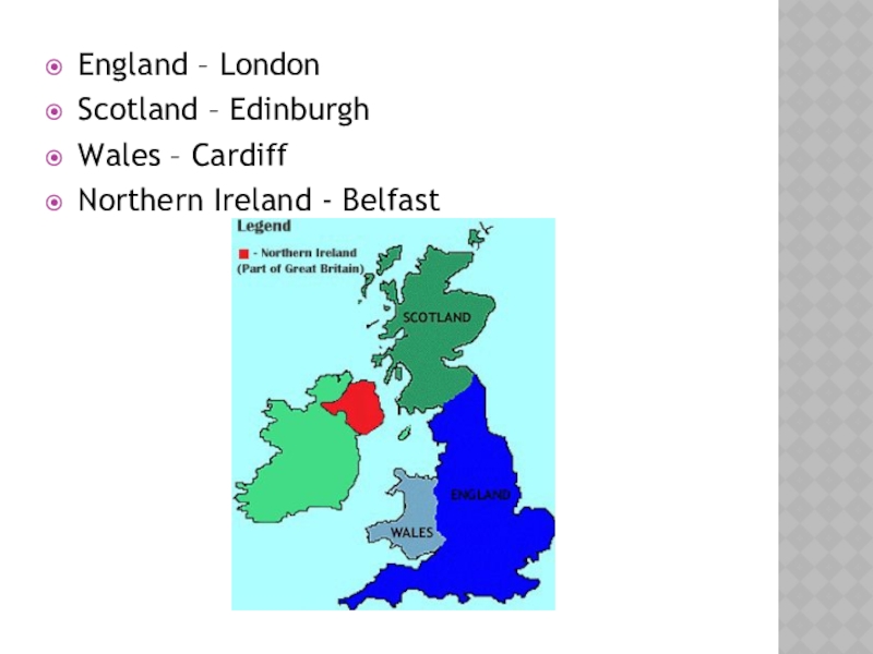 England – LondonScotland – EdinburghWales – CardiffNorthern Ireland - Belfast