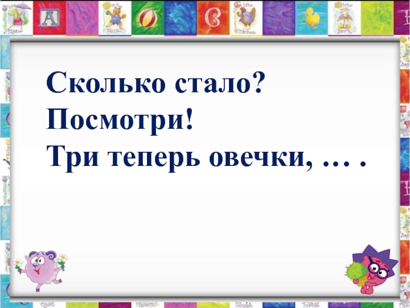 Слайд 5Сколько стало? Посмотри! Три теперь овечки, … .