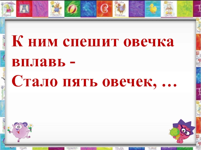 Слайд 9К ним спешит овечка вплавь - Стало пять овечек, …