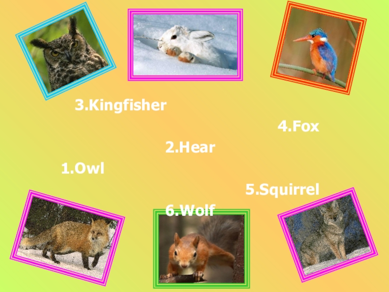 3.Kingfisher4.Fox2.Hear 1.Owl 5.Squirrel6.Wolf