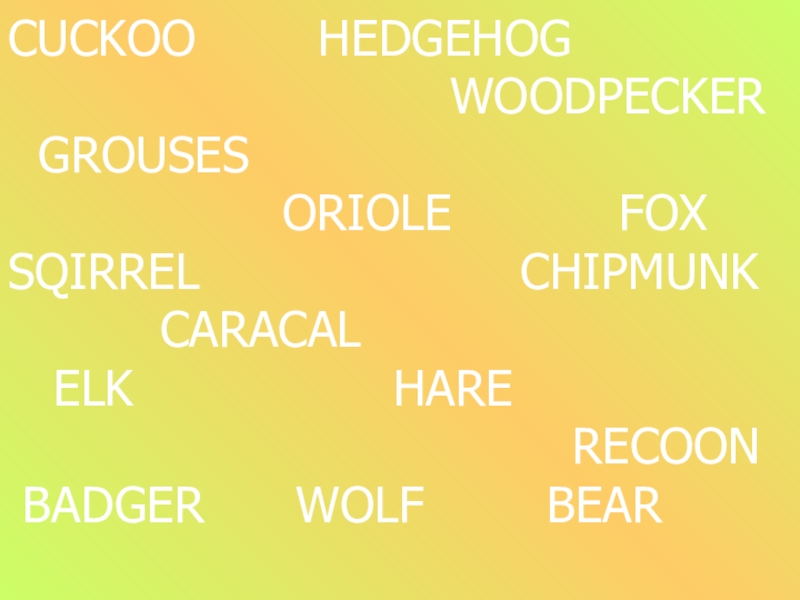 WOODPECKER GROUSES ORIOLE FOX SQIRREL CHIPMUNK CARACAL ELK HARE RECOON BADGER WOLF BEAR