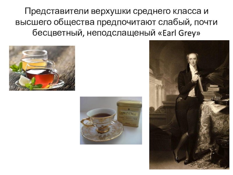 Представители верхушки среднего класса и высшего общества предпочитают слабый, почти бесцветный, неподслащеный «Earl Grey»