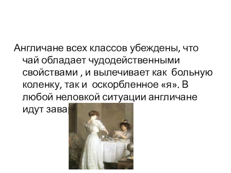 Слайд 14Англичане всех классов убеждены, что чай обладает чудодейственными свойствами , и