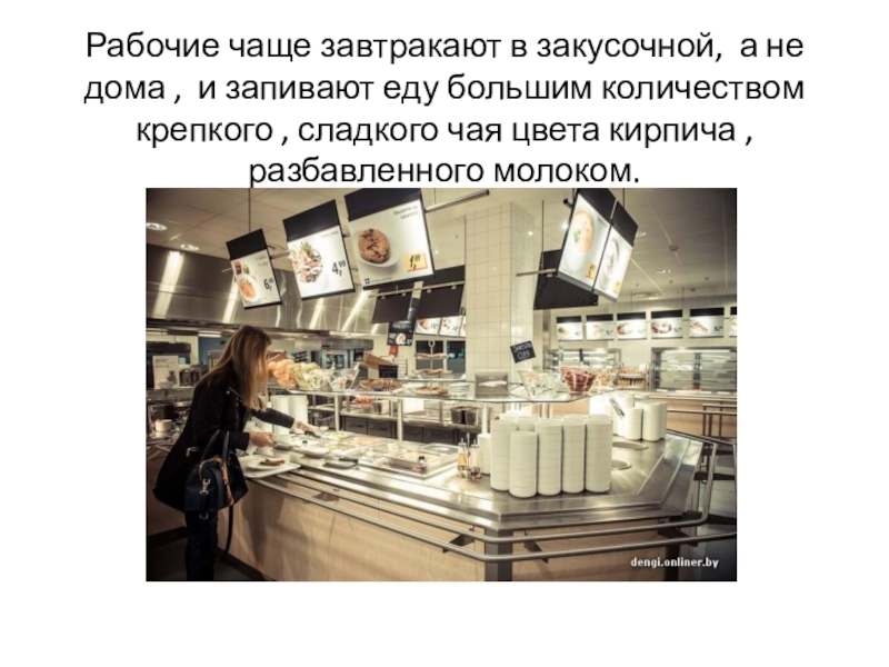 Слайд 11 Рабочие чаще завтракают в закусочной, а не дома , и запивают