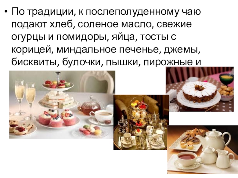 Слайд 15По традиции, к послеполуденному чаю подают хлеб, соленое масло, свежие огурцы