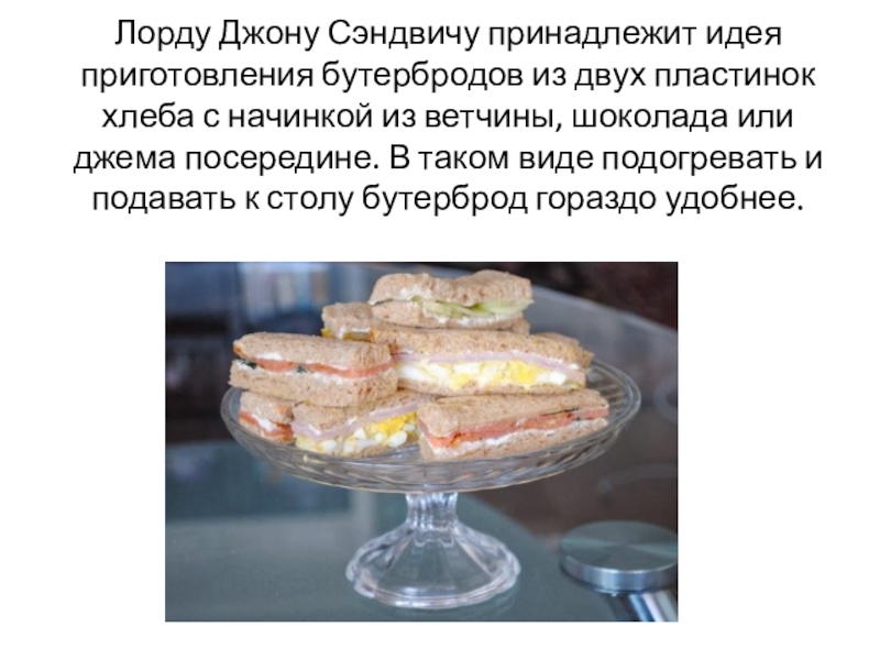Слайд 17Лорду Джону Сэндвичу принадлежит идея приготовления бутербродов из двух пластинок хлеба