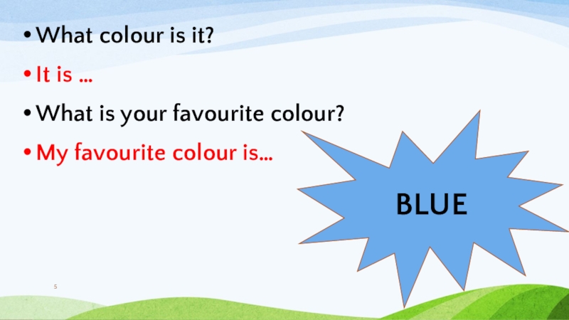 What colour is it?It is …What is your favourite colour?My favourite colour is…BLUE