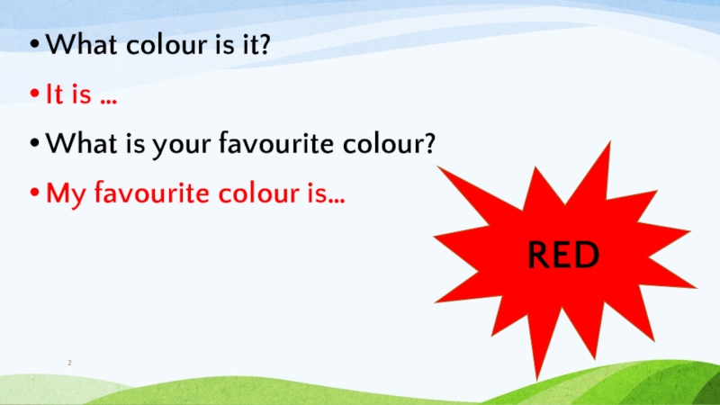 What colour is it?It is …What is your favourite colour?My favourite colour is…RED