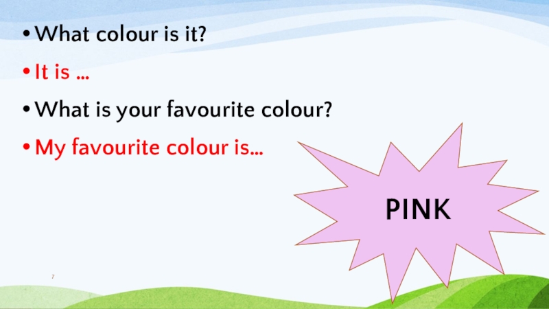 What colour is it?It is …What is your favourite colour?My favourite colour is…PINK