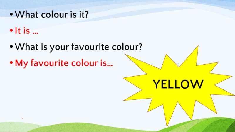 What colour is it?It is …What is your favourite colour?My favourite colour is…YELLOW