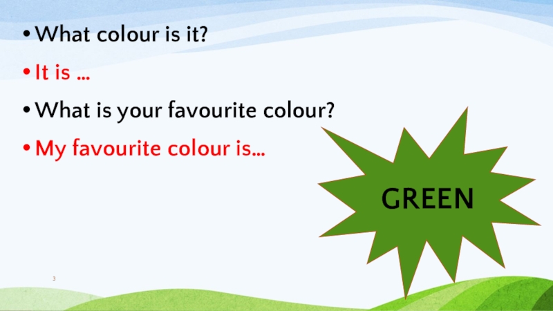 What colour is it?It is …What is your favourite colour?My favourite colour is…GREEN
