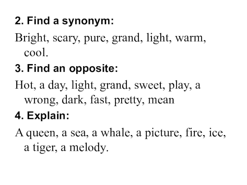 2. Find a synonym:Bright, scary, pure, grand, light, warm, cool.3. Find an opposite:Hot, a day, light, grand,