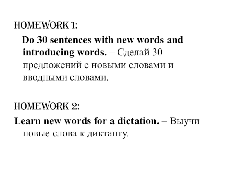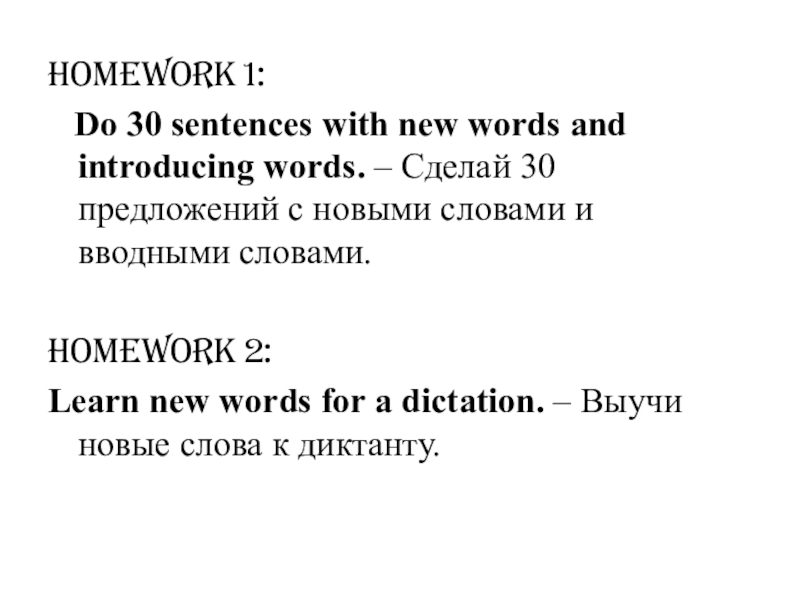 Homework 1:  Do 30 sentences with new words and introducing words. – Сделай 30 предложений с