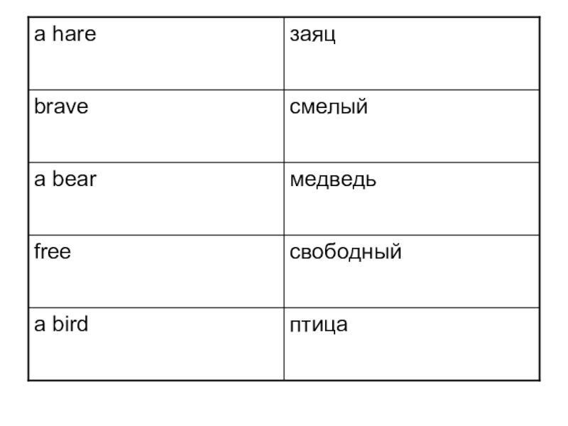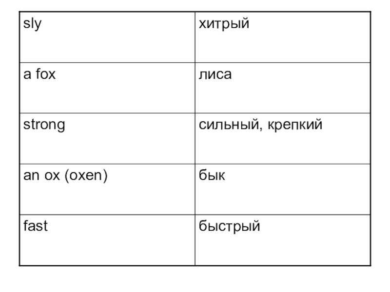 A bear, a fox, a mouse, an ox, a wolf, a bird, a hare, a toad, a tooth.