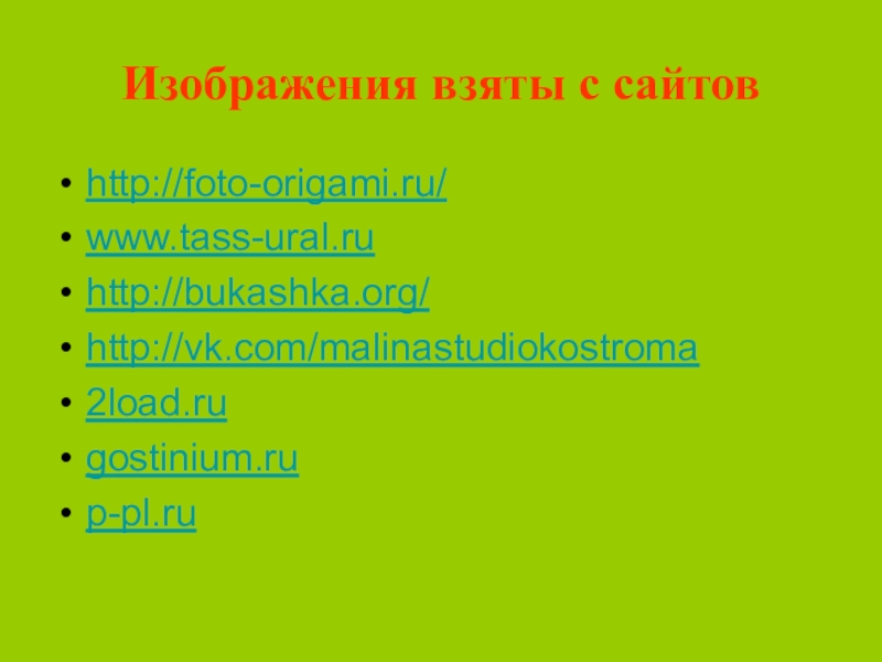 Изображения взяты с сайтовhttp://foto-origami.ru/www.tass-ural.ru http://bukashka.org/http://vk.com/malinastudiokostroma2load.rugostinium.ru p-pl.ru