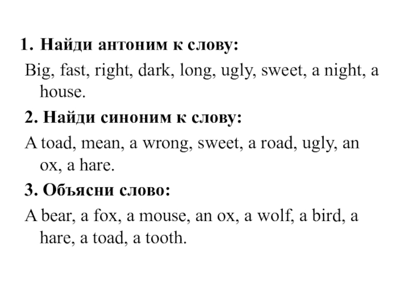 Найди антоним к слову:Big, fast, right, dark, long, ugly, sweet, a night, a house.2. Найди синоним к