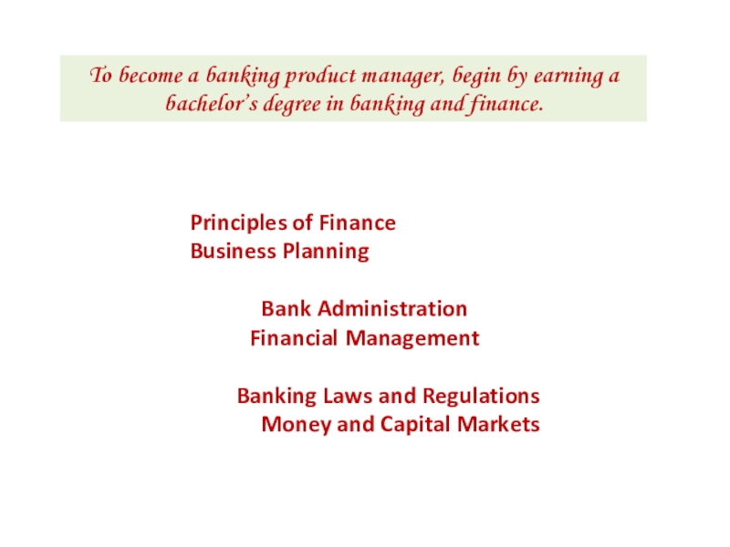 To become a banking product manager, begin by earning a bachelor’s degree in banking and finance.