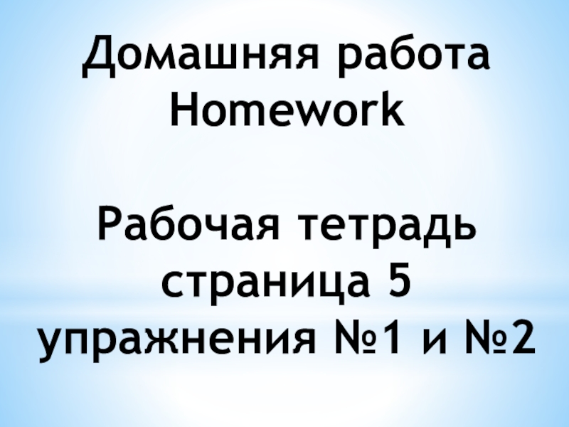 Слайд 11Домашняя работа Homework Рабочая тетрадь страница 5 упражнения №1 и №2