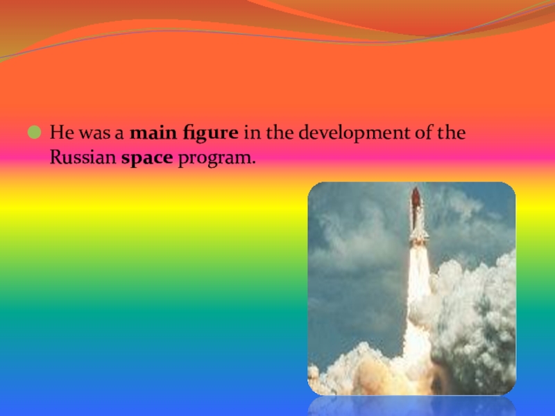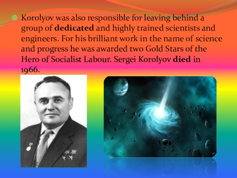 Слайд 13Korolyov was also responsible for leaving behind a group of dedicated and highly