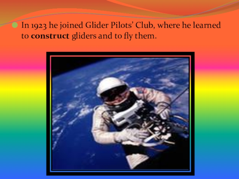 Слайд 4In 1923 he joined Glider Pilots’ Club, where he learned to construct gliders