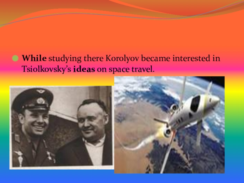 Слайд 10While studying there Korolyov became interested in Tsiolkovsky’s ideas on space travel.