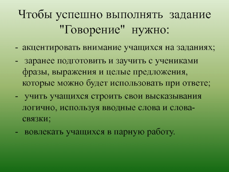Слайд 12Чтобы успешно выполнять задание "Говорение" нужно: