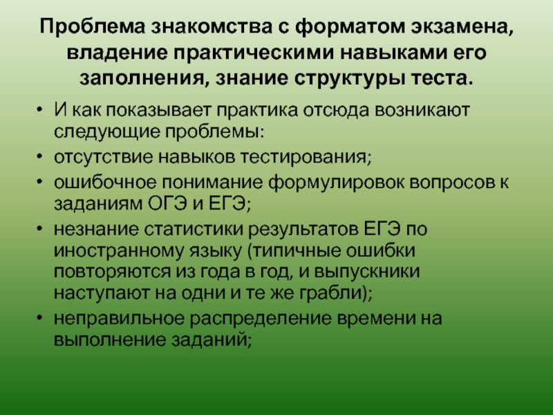 Проблема знакомства с форматом экзамена, владение практическими навыками его заполнения, знание структуры теста.