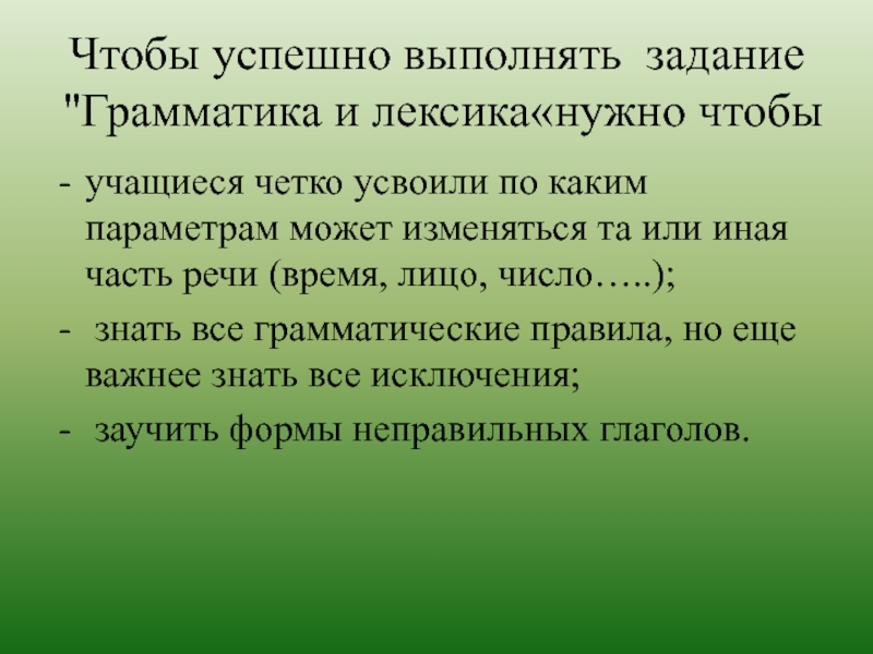 Слайд 10Чтобы успешно выполнять задание "Грамматика и лексика«нужно чтобы