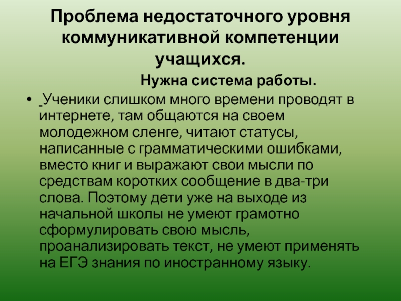 Ученики слишком много времени проводят в интернете, там общаются на своем молодежном сленге, читают статусы, написанные с грамматическими ошибками, вместо книг и выражают свои мысли по средствам коротких сообщение в два-три слова. Поэтому дети уже на выходе из начальной школы не умеют грамотно сформулировать свою мысль, проанализировать текст, не умеют применять на ЕГЭ знания по иностранному языку.