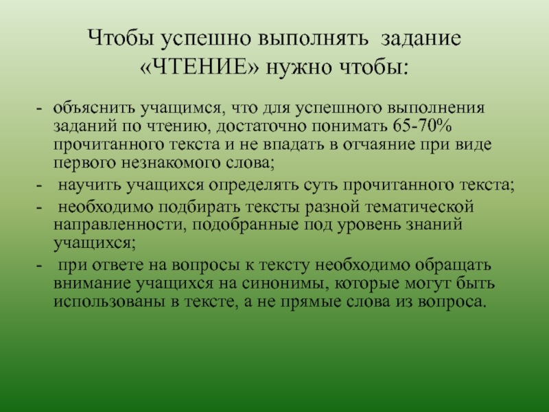 выполнения заданий по чтению, достаточно понимать 65-70% прочитанного текста и не впадать в отчаяние при виде первого незнакомого слова;