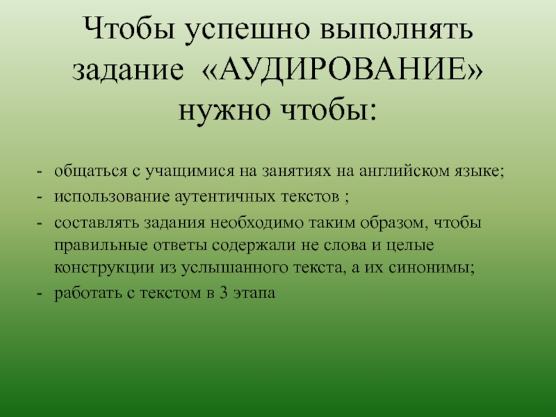 Слайд 8Чтобы успешно выполнять задание «АУДИРОВАНИЕ» нужно чтобы: