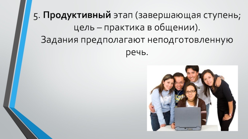 5. Продуктивный этап (завершающая ступень; цель – практика в общении).  Задания предполагают неподготовленную речь.